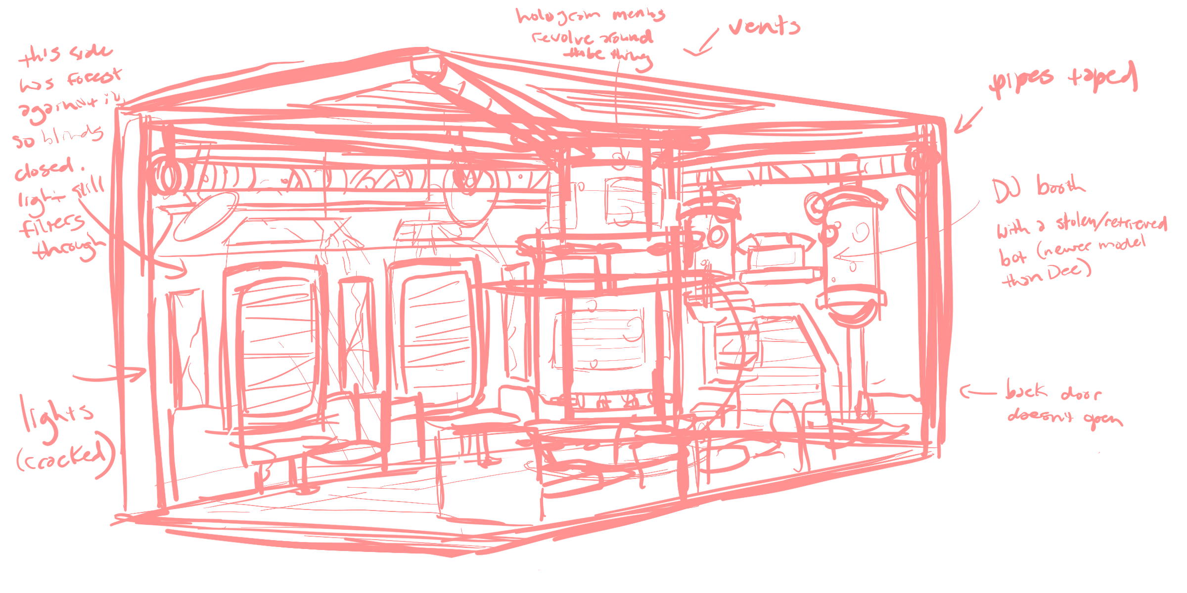 A seedy bar on a criminal planet. I decided that it had been repurposed from the remains of a crashed spaceship, so I looked at art of spaceship interiors for inspiration.