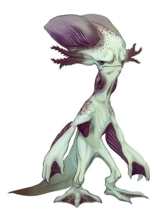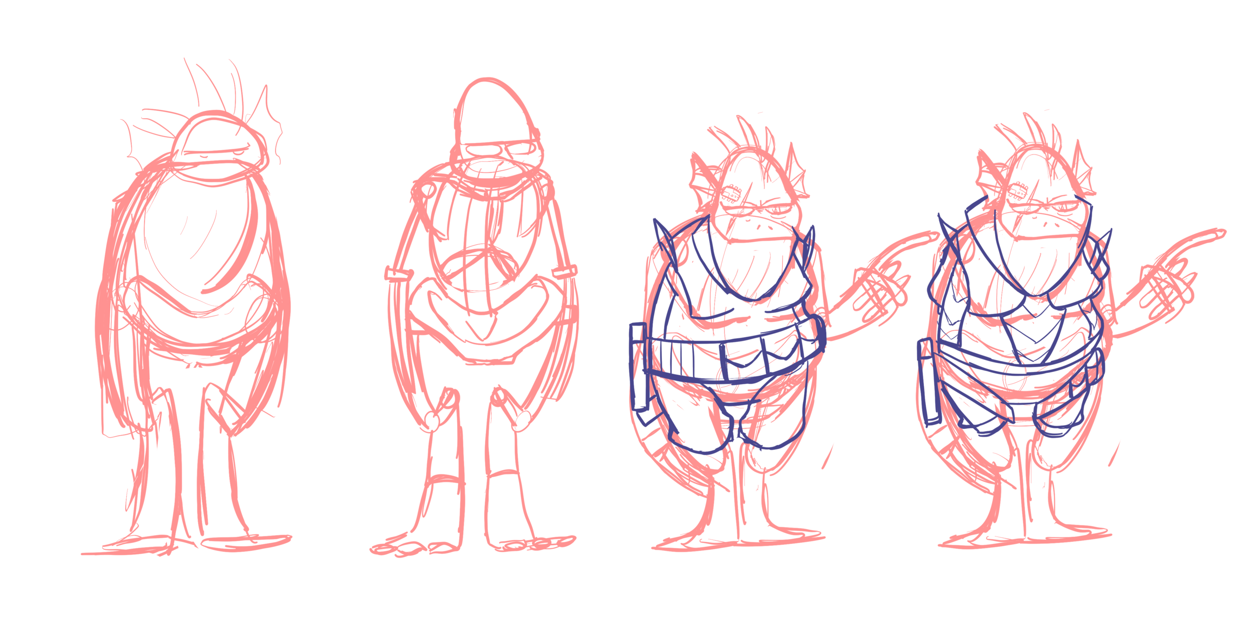 The owner of the bar. When I began designing Looga I already knew I wanted her to have froglike features, but pinning down her body shape was difficult. So I began sketching general shapes, and once I found one, I used my knowledge of anatomy to draw basic ribcage and pelvis shapes to finalize her build.