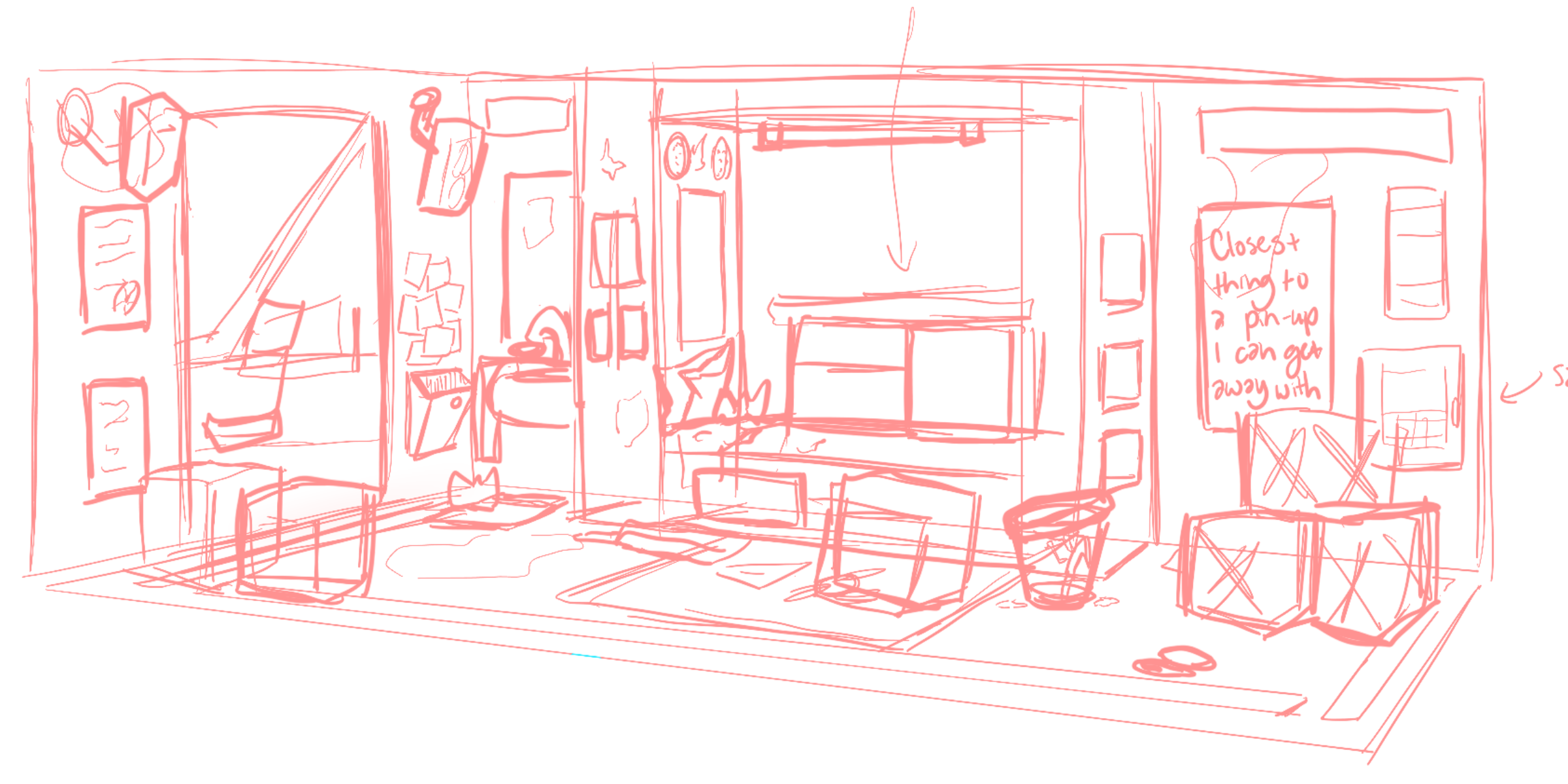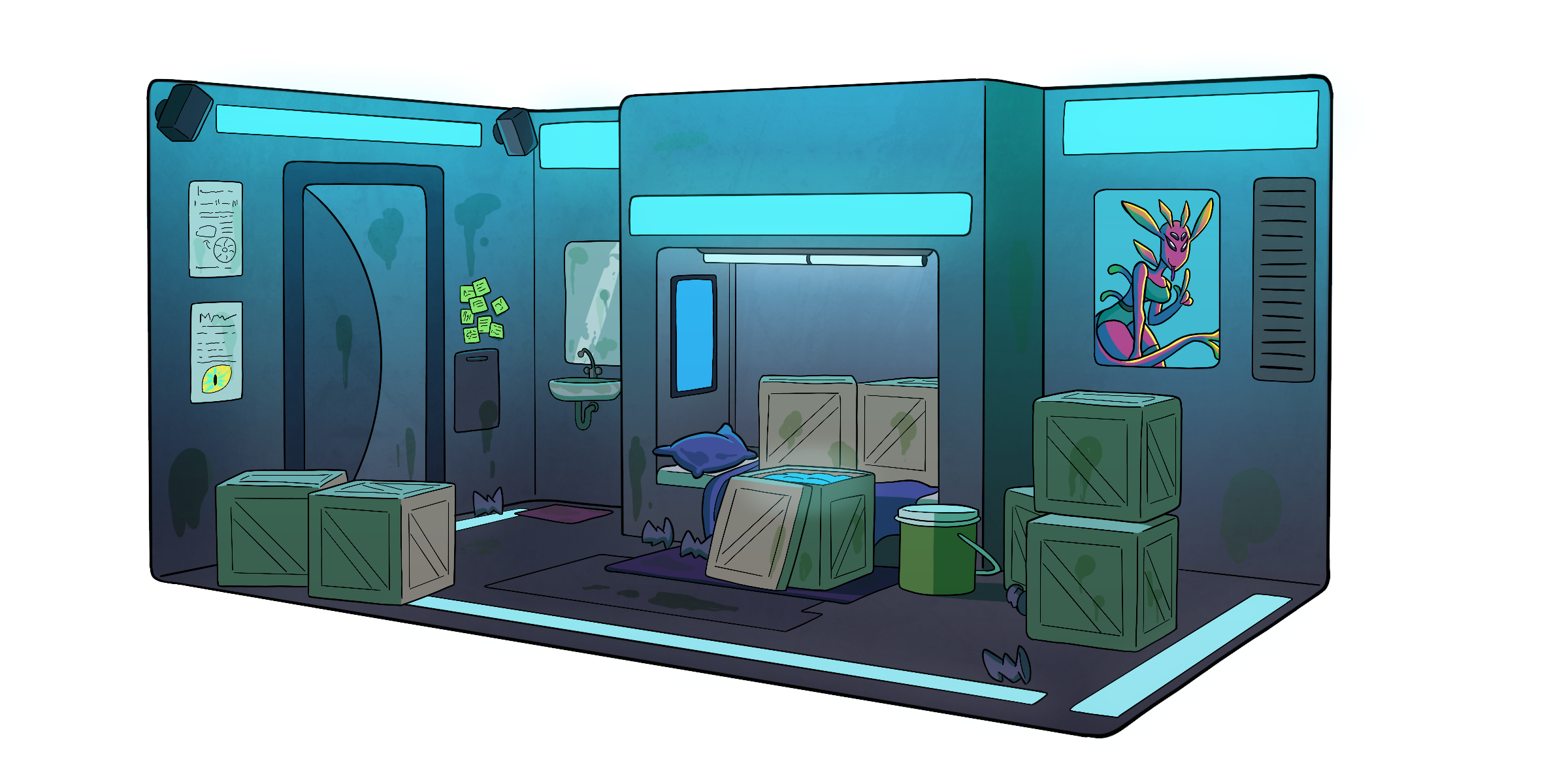 The inside of the smuggler’s ship. From what was in the script, the original owner seemed more like what one might call a “common criminal,” so I made sure his living quarters were dirty, stained, and had a pin-up of a girl of his own species.